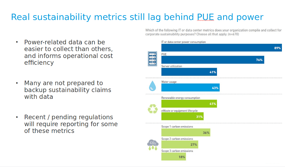 Until recently, there hasn’t been much involvement by governments on the sustainability front, but that’s started to change, with recently started and upcoming regulations set to require data centers to monitor and report metrics, some of which haven’t traditionally been monitored by data center operators. These metrics are for the most part centered around emissions generated by data center operations, mainly focused on the use of electricity and water.