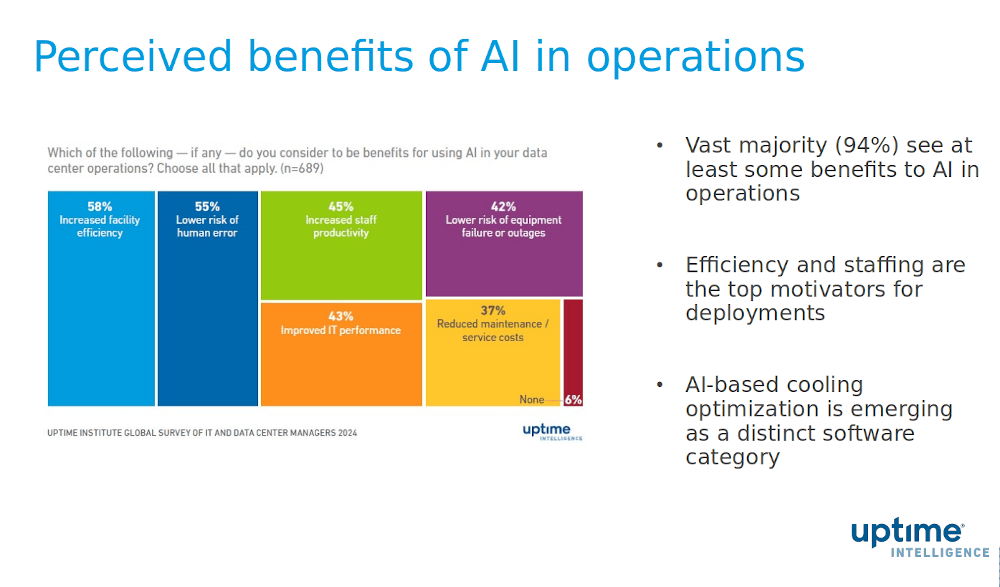 “I found it interesting that 94% at least see some benefits to using AI in operations, that it’s a very small 6% that say that none of these would really be improved or be seen as benefits.” Doug Donnellan, research analyst pointed out in an online briefing Uptime sponsored to discuss the survey.