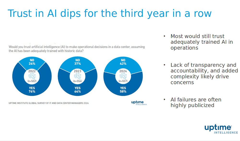 Another survey question asked for a simple yes or no response: “Would you trust artificial intelligence to make operational decisions in a data center, assuming the AI had been adequately trained with historic data?”