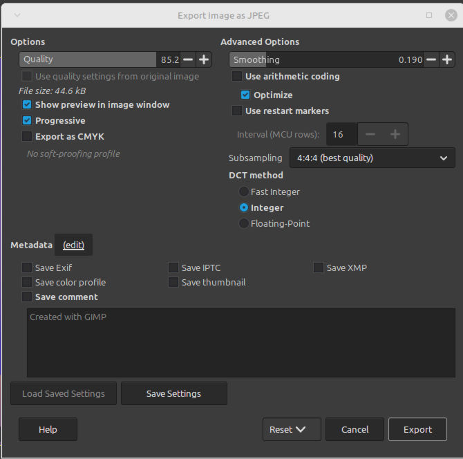 Exporting an image as a JPEG. Note, Gimp’s default dark theme.