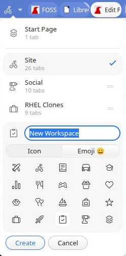 You can also create a workspace on the fly. I created the RHEL Clones workspace when an idea hit me while looking at the changelog for the latest release from Almalinux. To create it, all I had to do was right-click on the webpage’s tab and select Move>Create Workspace with This Tab. When a workspace is created this way, the user is immediately taken to the new tab.