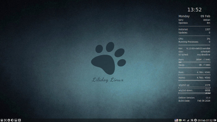 On Friday, Lilidog Linux, a newish distro that’s been around for about six years, released version 26.02.06. The distro is based on Debian 13 “Trixie” stable, and features a customized Openbox window manager. It comes in three basic flavors: Lilidog, which is the default Openbox version; Beardog, which is barebones without the display manager; and Waydog, which is the Wayland version featuring the Labwc and Sway Wayland compositors.