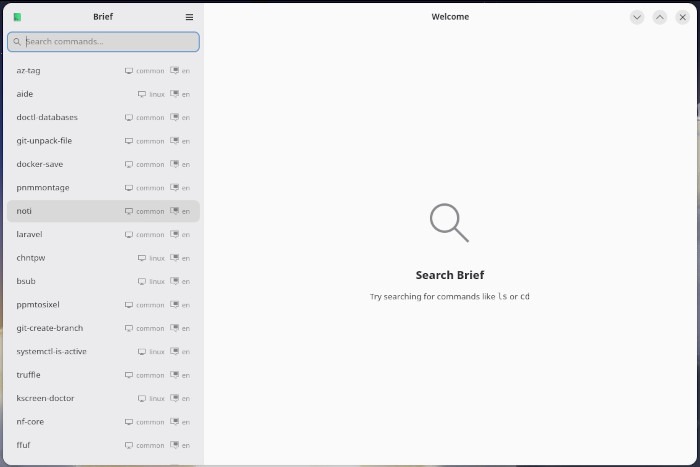 Brief is incredibly simple to use. Open the app from your desktop menu and you’ll be presented with the main page. In the left sidebar, you’ll find a long list of Linux commands you can search through. If you don’t want to doom scroll through the list, use the handy search feature to find what you’re looking for.