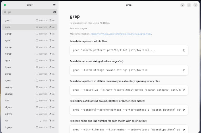 Consider this: You know the command you need is grep, but you don’t want to have to take the time to read through the nitty-gritty of the man page. Instead, you open Brief, locate grep, and view the sample commands to figure out exactly how you need to use the tool.