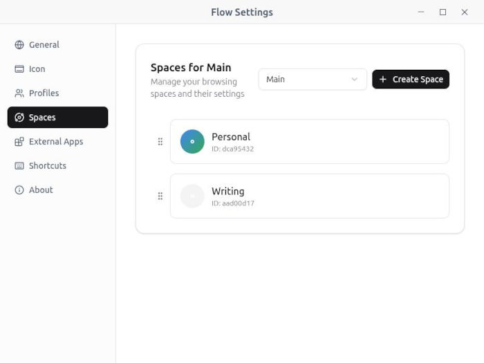 When you first use Flow, you get to set up your first Workspace. You get to name it, theme it, and give it an icon. You can then add more Workspaces by clicking the gear icon at the bottom left corner, navigating to Spaces, clicking Create Space, and walking through the simple wizard.