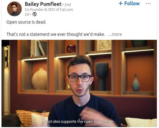 “Open source is dead,” Cal.com co-founder and CEO Bailey Pumfleet posted on LinkedIn on Wednesday, a day after he announced that the company is going proprietary. “That’s not a statement we ever thought we’d make.”