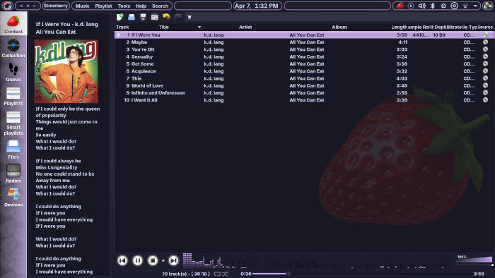 Listening to k.d. lang with Strawberry on Garuda Linux.