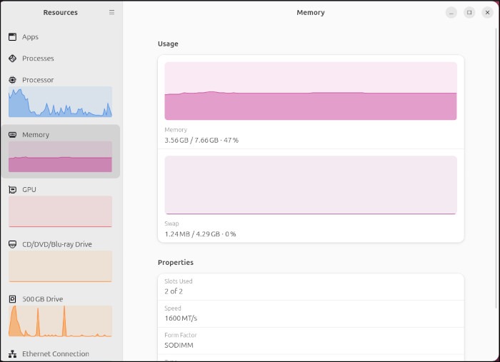 The Resources app deserves special mention. It’s a relatively new application from GNOME, built with GTK4/libadwaita and designed with a modern interface. While not yet included among GNOME’s core default apps, it overlaps significantly with the functionality of GNOME System Monitor and GNOME Power Statistics, allowing users to monitor CPU, memory, GPU, network, storage, and power usage.
