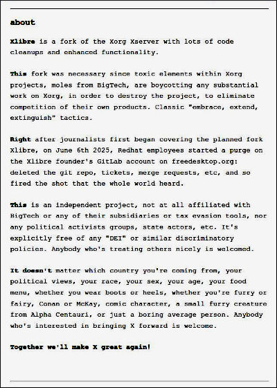 Using a dog whistle that’s become much too familiar lately, Xlibre’s About page places the blame for discrimination on the organizational concept of DEI, which stands for Diversity, Equity, and Inclusion, and which is meant to keep discriminatory practices in check.