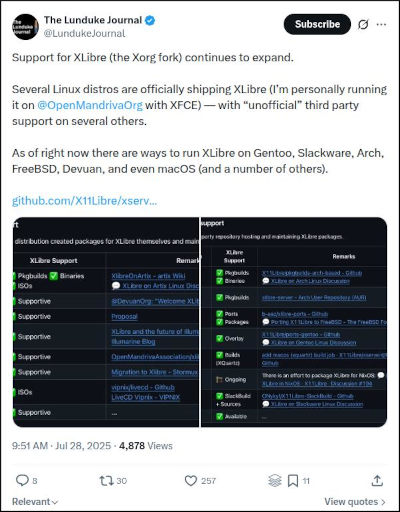 Both of those are interesting. For the former, the fork of Xorg X server wasn’t publicly known before this email, and wouldn’t be officially announced until several months later. It’s mentioned in the email’s subject — “Xlibre fork release coming in few days” — and at the bottom there’s a call to join the Xlibre mailing list, along with a link to the new project’s GitHub page.